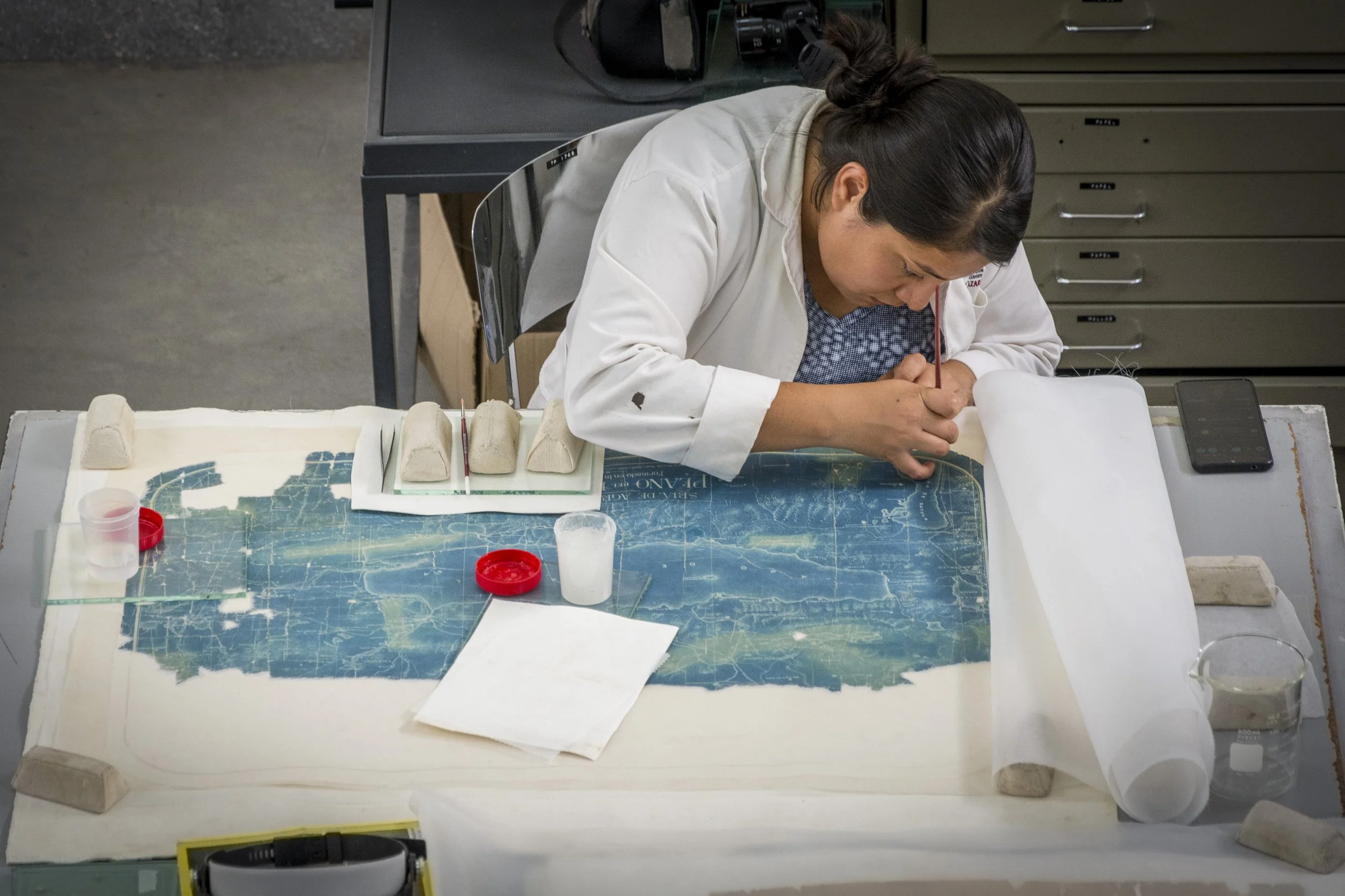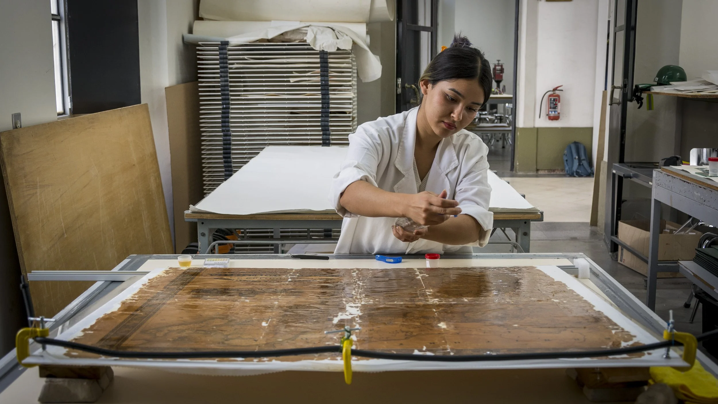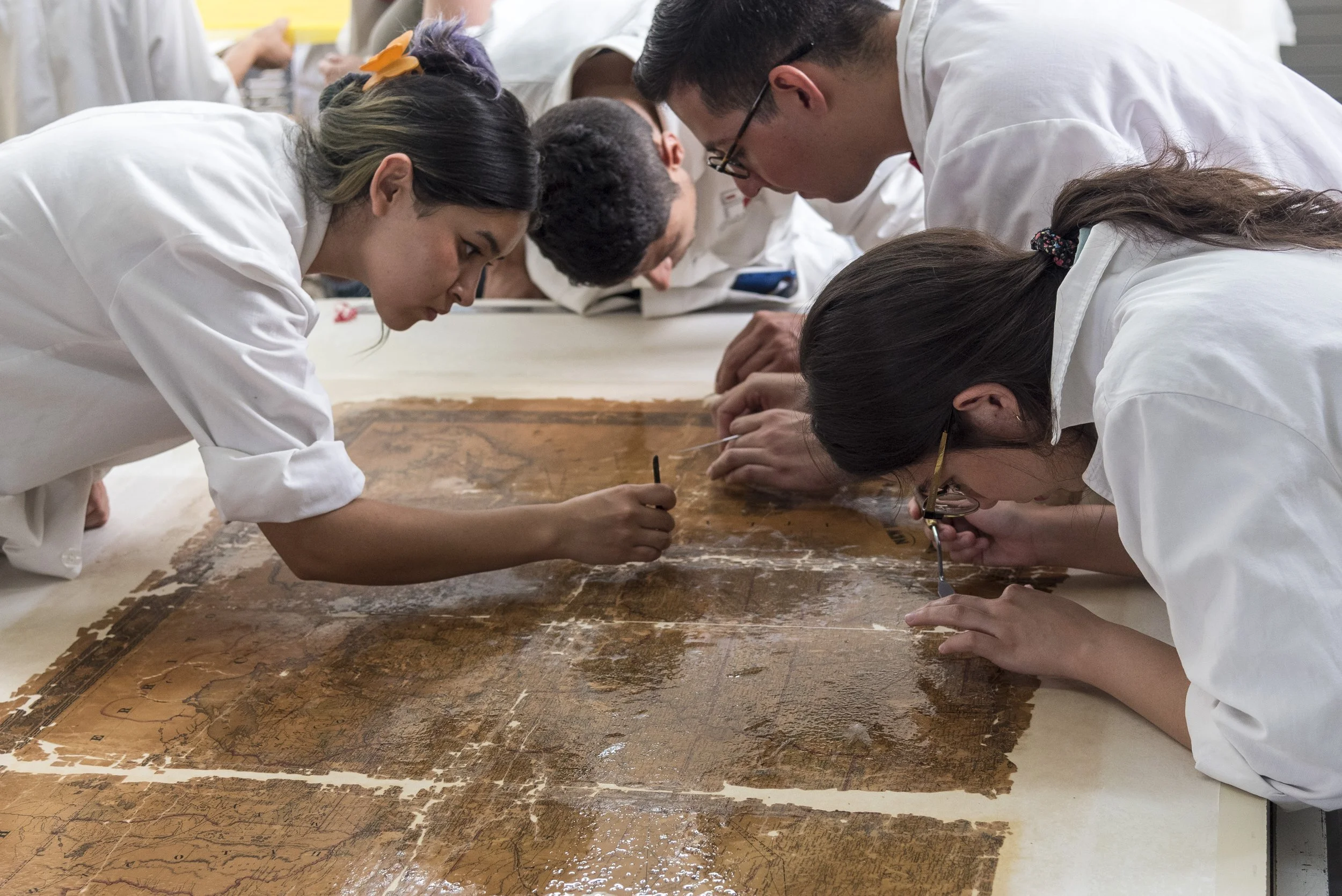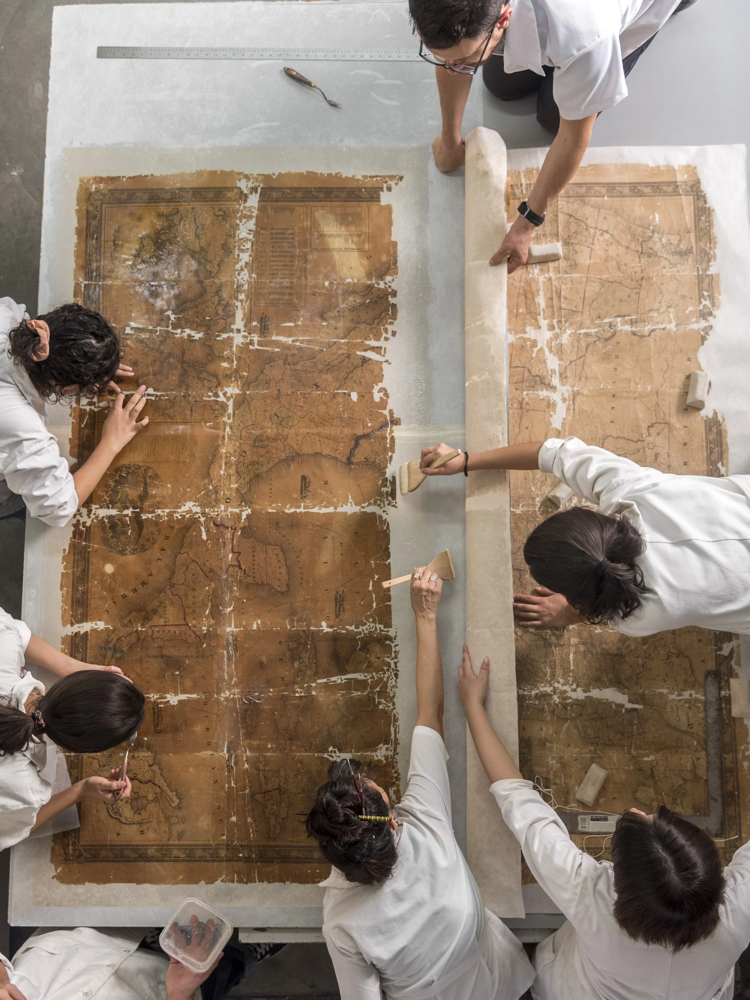 Entre los procesos de intervención que se implementaron para atender estos deterioros, las alumnas y alumnos realizaron un lavado y aplicaron un soporte auxiliar de papel japonés, así como refuerzos e injertos del mismo material teñido.