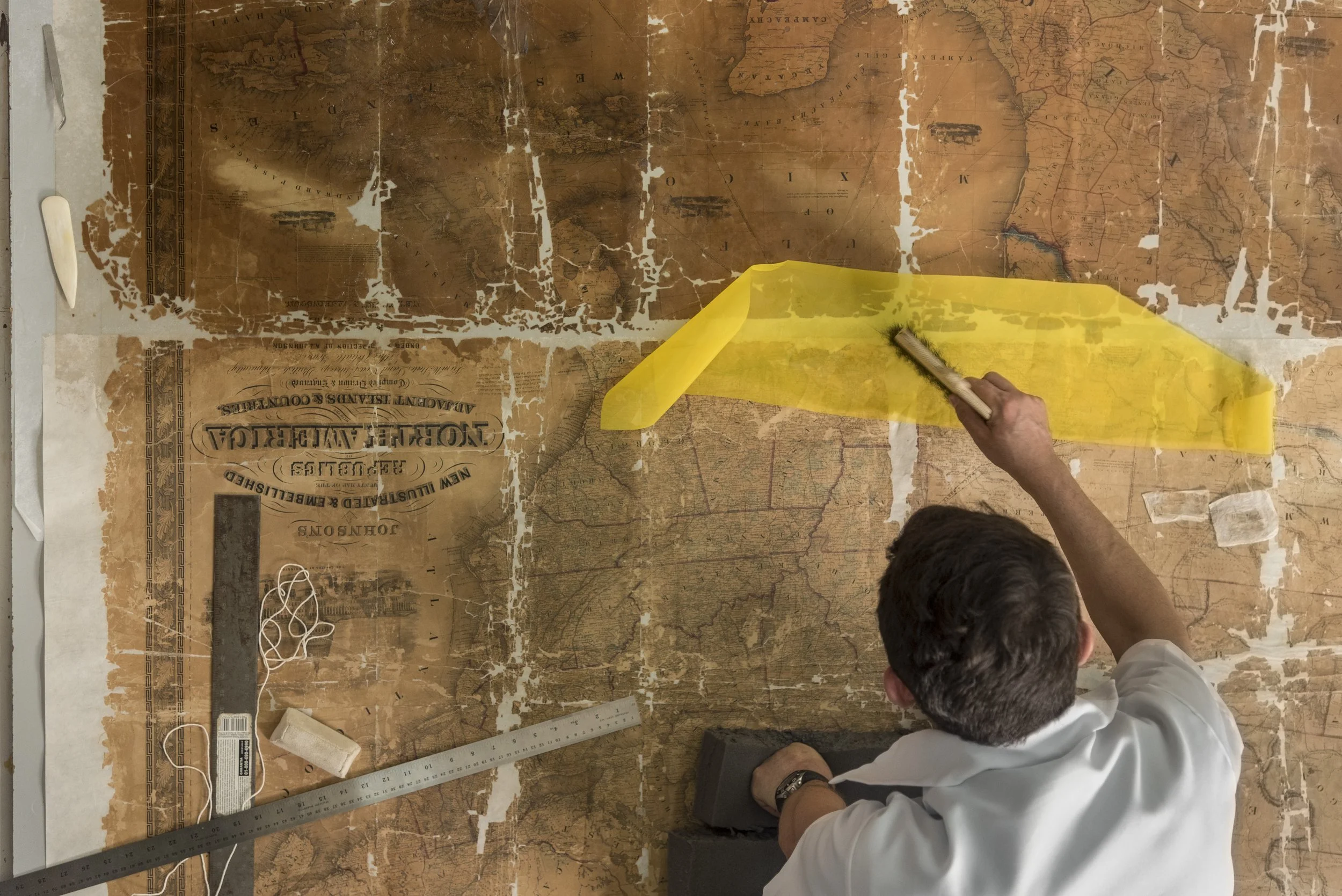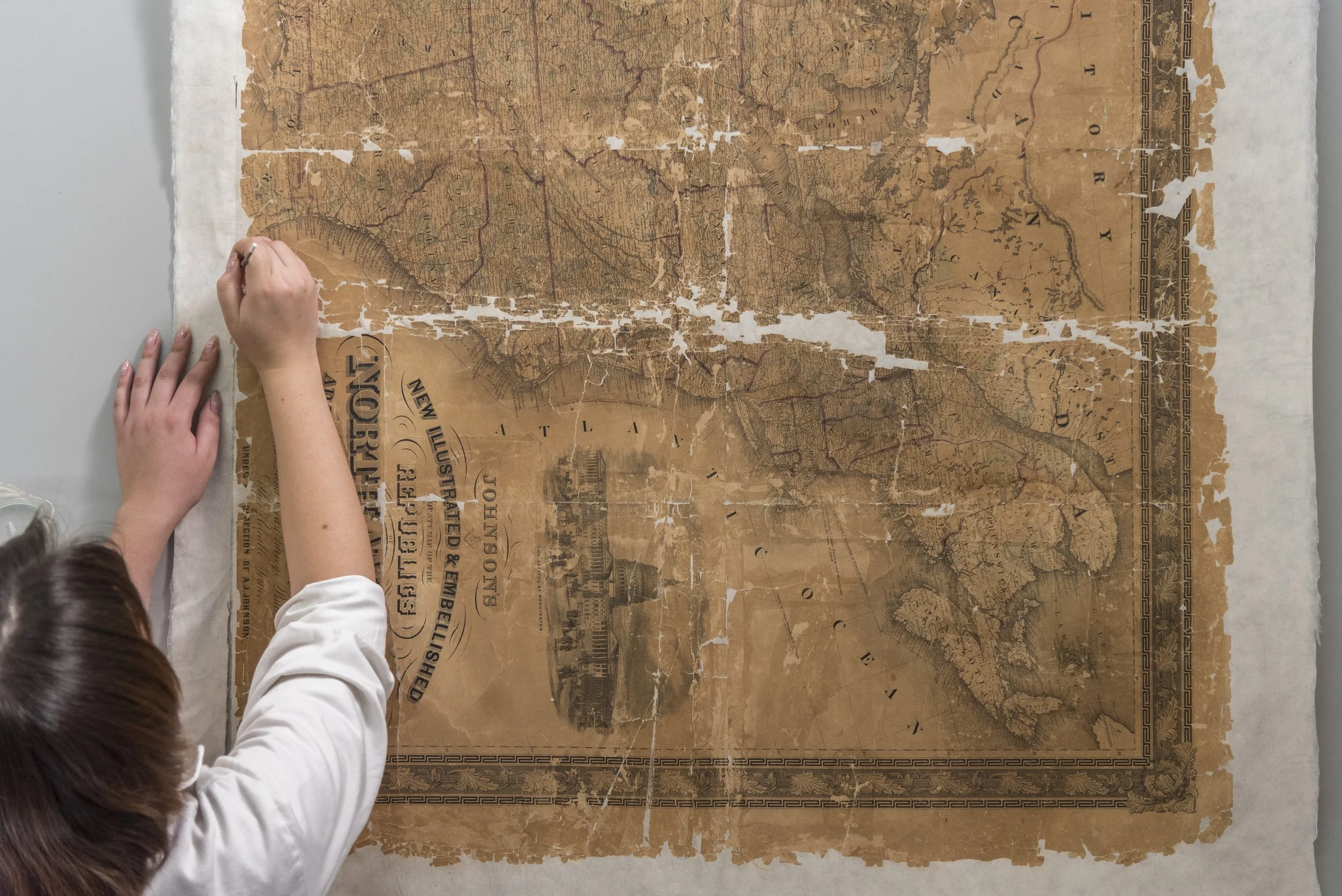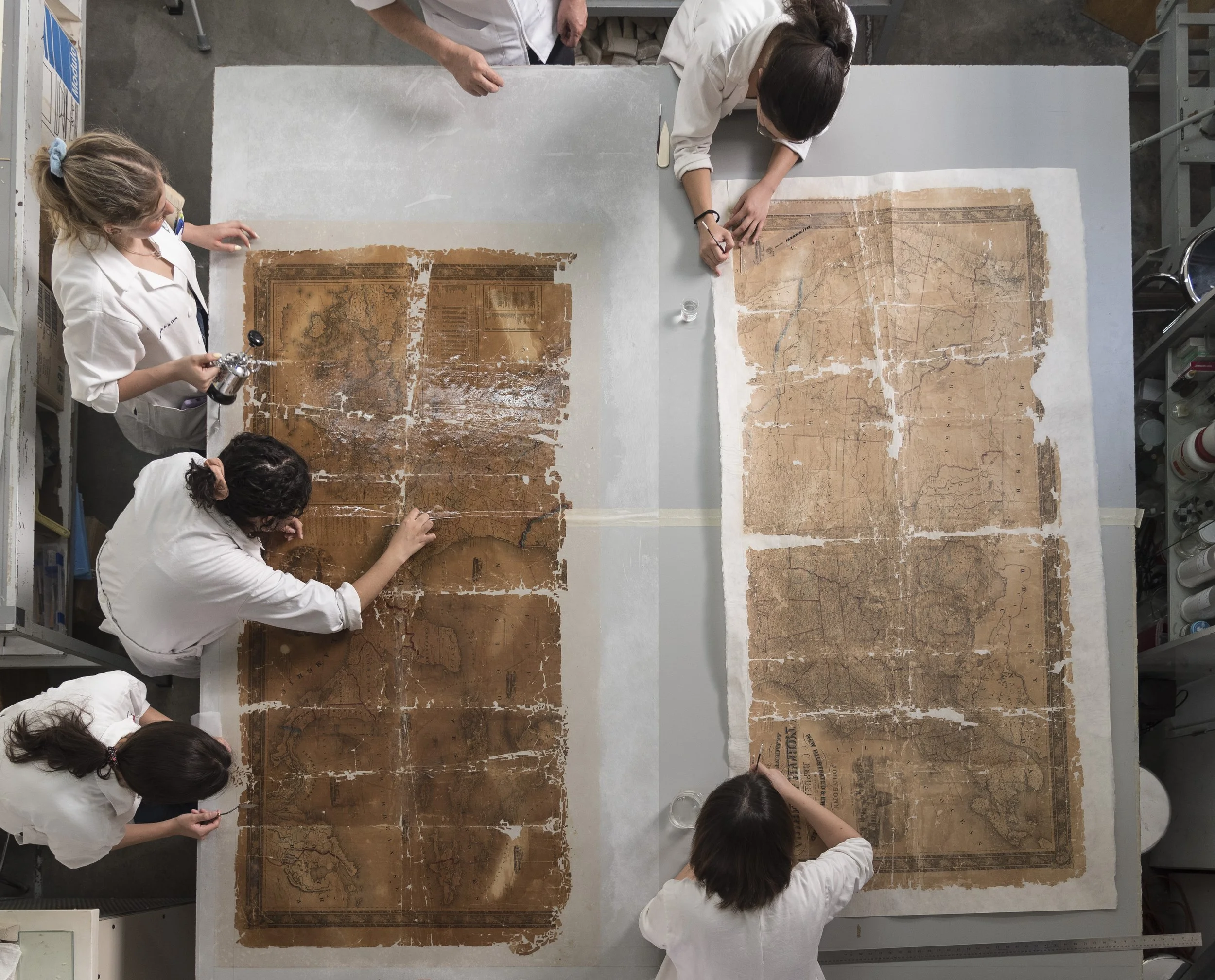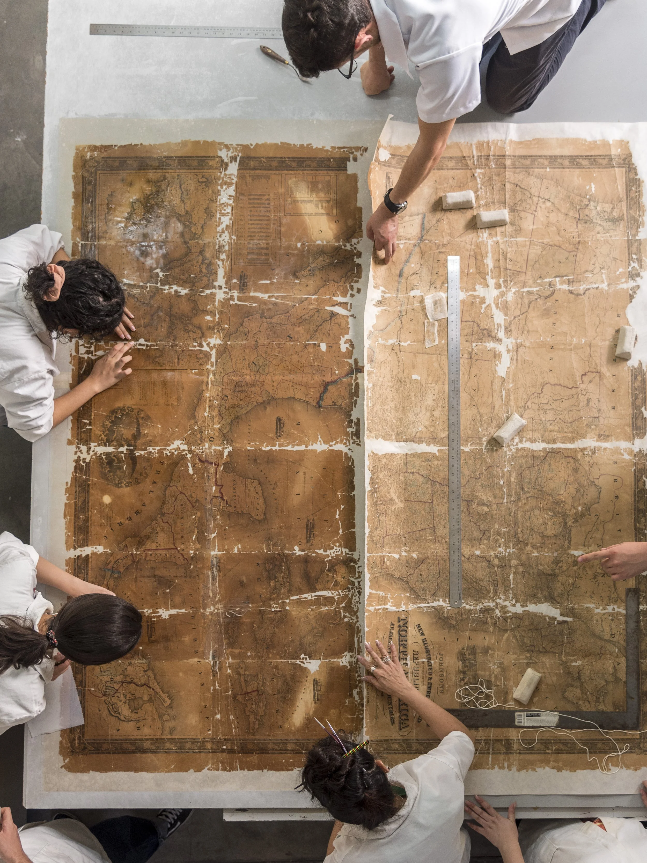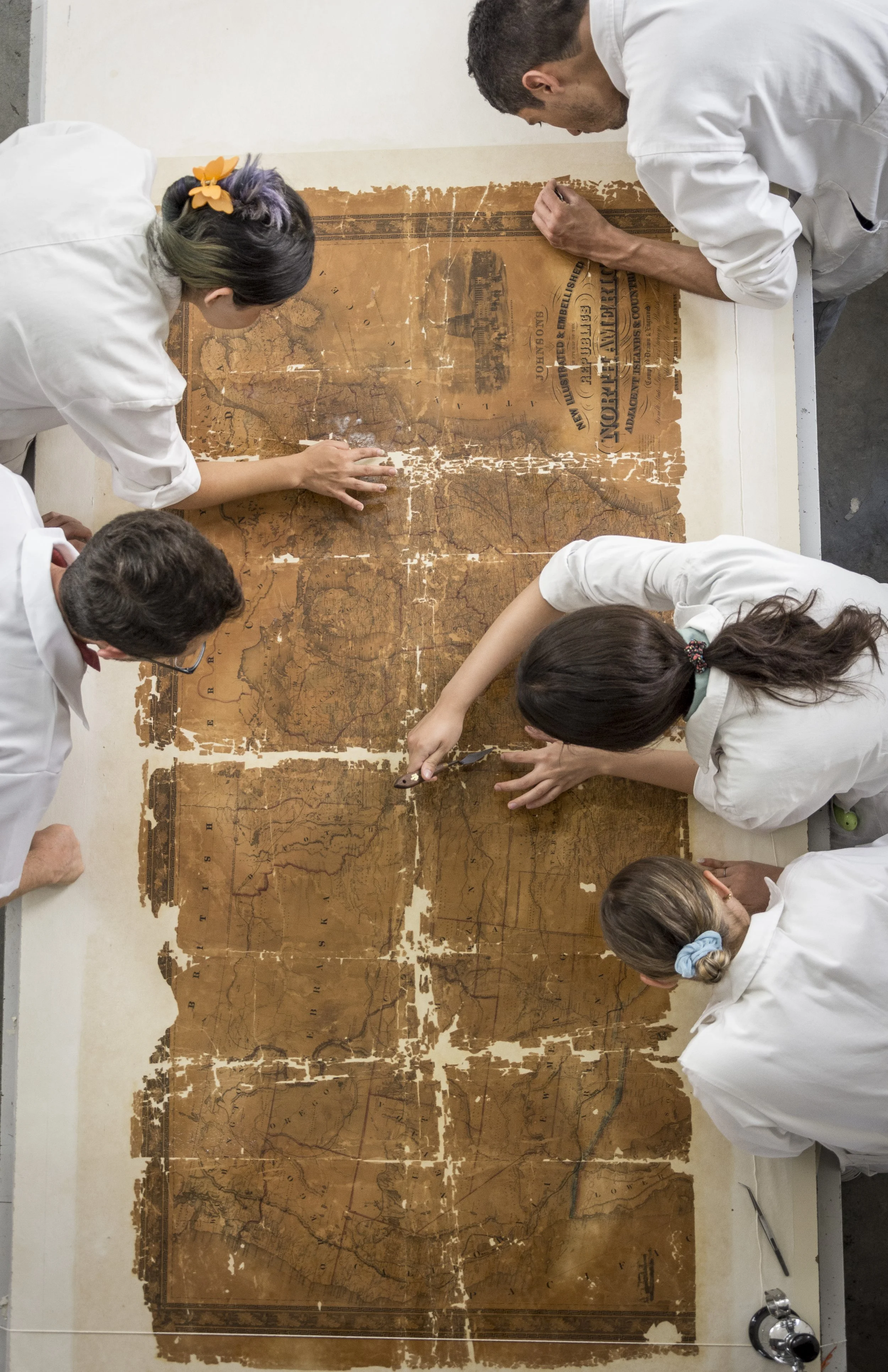 Entre los procesos de intervención que se implementaron para atender estos deterioros, las alumnas y alumnos realizaron un lavado y aplicaron un soporte auxiliar de papel japonés, así como refuerzos e injertos del mismo material teñido.